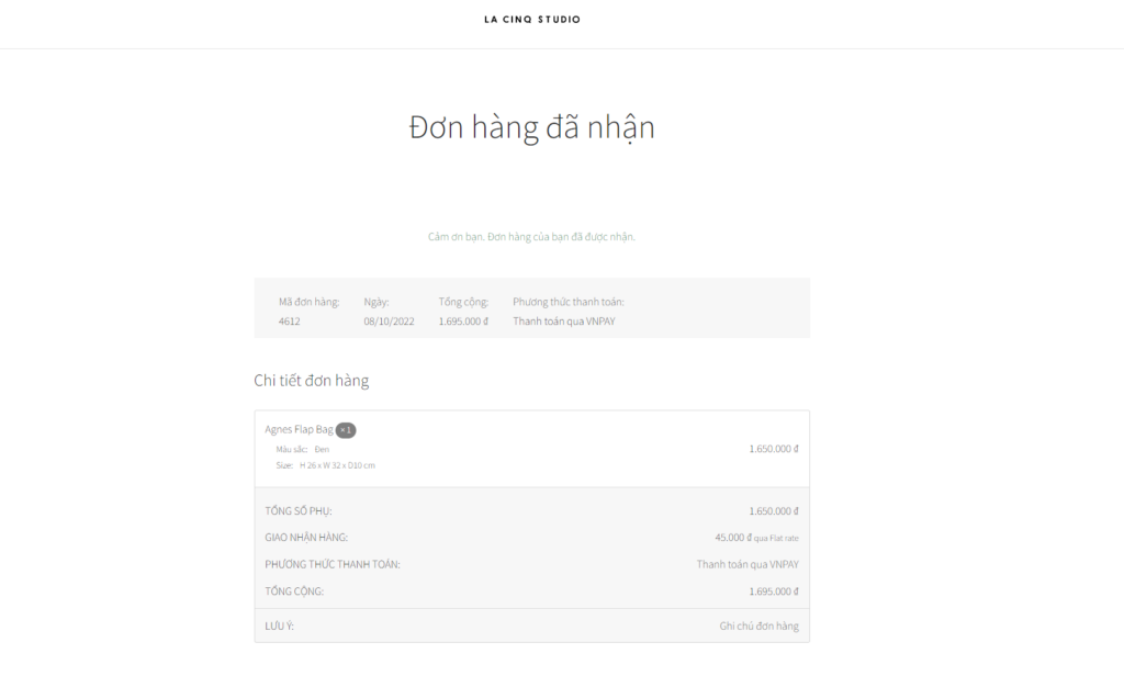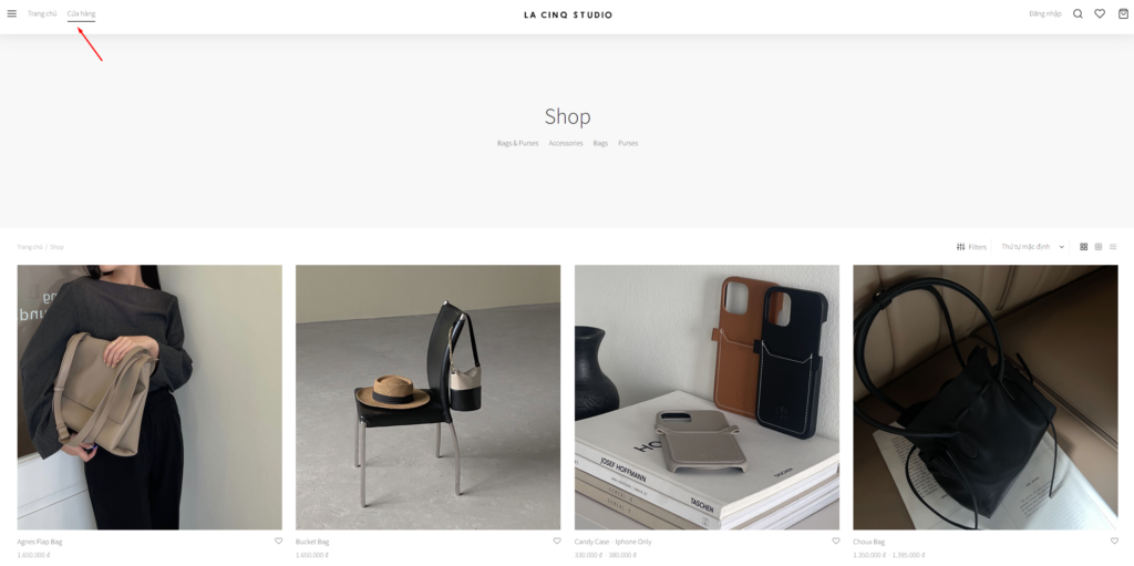 Khách hàng truy cập vào trang chủ của LA CINQ Studio tại đường dẫn https://lacinqstudio.com sau đó khách hàng nhấn vào mục “Cửa hàng”