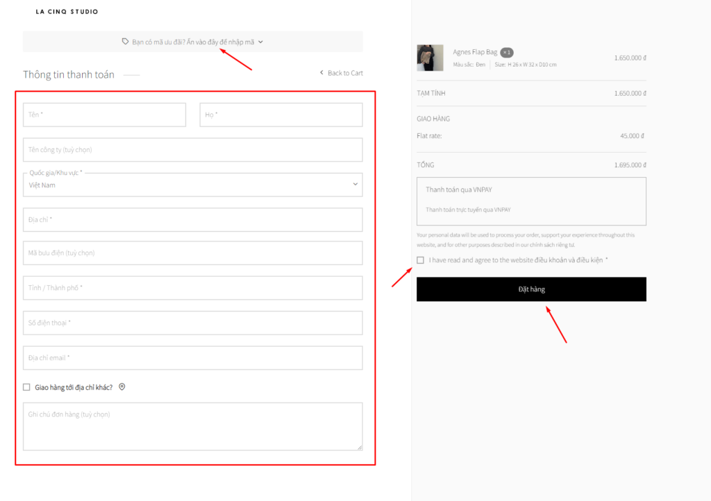 Tại trang thông tin thanh toán, quý khách vui lòng điền đầy đủ thông tin theo mẫu và đồng ý với điều khoản và điều kiện của website, sau đó nhấp vào nút “Đặt hàng”, nếu quý khách có mã khuyến mại quý khách có thể nhập mã để được hưởng ưu đãi.